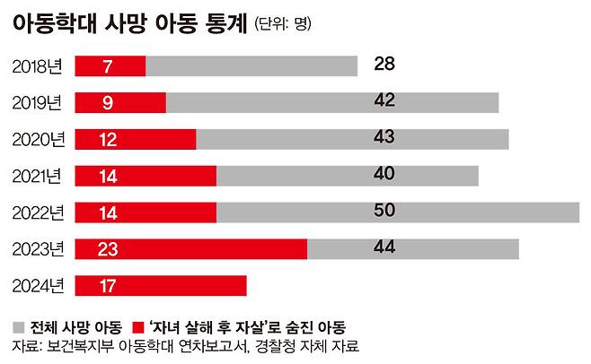 도윤과 윤서처럼 죽음을 결심한 부모에게 살해당하는 아동·청소년은 해마다 10~20명 안팎에 이른다. 보건복지부는 매년 8월 말 아동학대 연차보고서를 발표한다. 아동학대 사망 아동 가운데, 부모가 자녀를 살해하고 본인도 죽는 ‘자녀 살해 후 자살’로 숨진 아동은 2018년 7명, 2020년 12명, 2021·2022년 각각 14명, 2023년 23명에 이른다. 2024년 아동학대 연차보고서는 아직 발표 전이지만, 경찰은 2024년에 18살 미만 아동·청소년 17명이 부모에게 살해당한 것으로 파악했다. 아동학대 연차보고서 통계는 경찰뿐 아니라 지방자치단체 통계, 언론에 보도된 사례 등을 취합하기 때문에 이보다 더 많을 가능성이 있다.