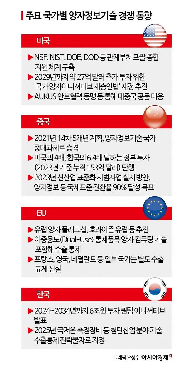 미국과 중국, 유럽연합(EU) 등 주요 기술 강국들은 10여년 전부터 국가 차원에서 양자정보기술 관련 정책을 수립하고, 대규모 예산을 투입하면서 자국 기술 보호를 위한 국가전략기술 지정 및 수출통제도 확대하고 있다. 핵심 동맹국과의 교류만 허용하는 등 미국과 중국을 중심으로 한 편 가르기 현상도 뚜렷하다.