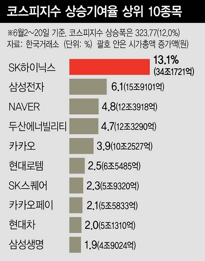 지수 상승에 가장 큰 기여를 한 기업은 에스케이(SK)하이닉스였다. 하이닉스 주가는 이 기간 23.86% 오르며 시가총액이 전체 증가분의 13.1%에 이르는 34조1721억원 불어났다. 코스피는 시가총액으로 산출하는 까닭에, 시가총액 증가 기여율이 사실상 지수 상승 기여율이다. 삼성전자는 주가가 4.75% 오르는 데 그쳤지만, 시가총액이 15조9101억원 늘며 전체 증가분의 6.1%를 차지했다.
