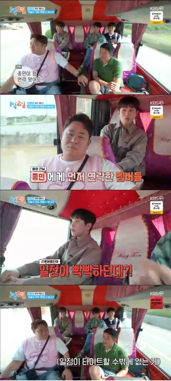 이준은 "종민이 형이 없으니까 빈자리가 크긴 크다"고 말했다. 주종현PD는 멤버들에게 김종민의 연락이 왔었는지 물어봤다.