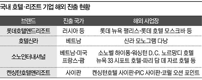 글로벌 체인들의 활약과 달리 국내 호텔·리조트 기업들의 활발한 글로벌 진출은 아직 소극적인 모습이다. 롯데호텔앤리조트, 호텔신라, 소노인터내셔널, 켄싱턴리조트 등 일부 기업만이 제한적으로 해외에 진출해 있을 뿐다.