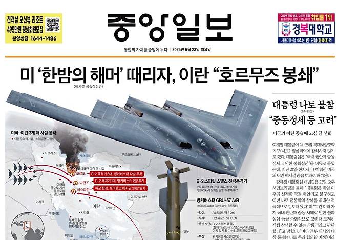 ▲ 중앙일보 = 미 '한밤의 해머' 때리자, 이란 "호르무즈 봉쇄"