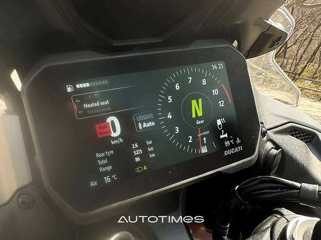 실제로도 멀티스트라다 V4 GT는 편안함에 초점을 맞추고 있다. 시승차엔 제거됐지만 사이드 케이스가 마련되고 열선 시트와 그립, 중앙 스탠드, 스마트폰 무선 충전 공간 등은 단순한 투어링 장비를 넘어 ‘여정에 최적화된 기계’를 선언한다. 외관은 여전히 날카롭고 스포티하지만, 그 안에는 조용한 사려 깊음이 숨어 있다.