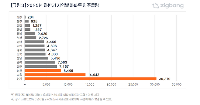 권역별로는 수도권이 5만2828가구로, 상반기 대비 12% 적다. 서울 1만4043가구, 경기 3만379가구, 인천 8406가구가 입주한다. 경기는 상반기와 비슷한 물량이 입주하는 한편 서울과 인천은 상반기 대비 각각 20%, 27% 적은 물량이 공급된다.