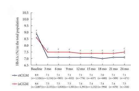 추적 관찰 종료까지 모든 시점에서 간헐적 스캔형 혈당측정기보다 실시간 연속혈당측정기를 사용할 때 당화혈색소 수치가 낮았다.
