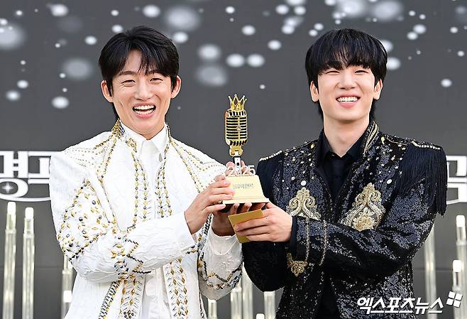 이날 행사에 참석한 가수 신승태와 최수호가 포토타임을 갖고 있다.