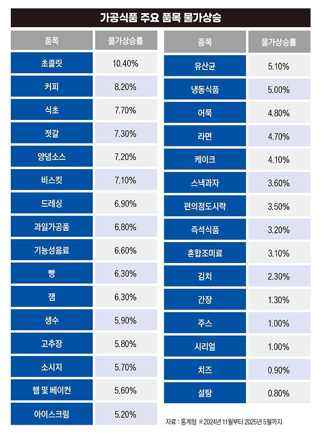 통계청 5월 소비자물가동향에 따르면 가공식품 물가의 작년 동기 대비 상승률은 4.1%로 계엄 사태 이전인 지난해 11월 1.3%의 세 배를 웃도는 수준이다. 다섯 달 만에 1%대(1.9%)로 내려온 전체 소비자물가와도 비교된다.