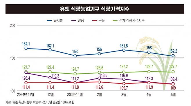 세계 곡물가격지수는 지난해 11월 111.4에서 올해 5월 109.0으로 6개월간 2.2% 하락했다. 유지류 가격 역시 164.1에서 152.2로 7.3% 내려갔다.