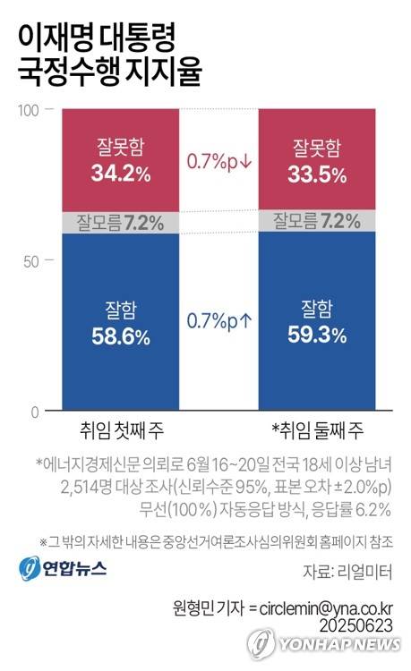 (서울=연합뉴스) 원형민 기자 = 이재명 대통령의 취임 후 둘째 주 국정수행을 긍정적으로 평가한 비율이 59.3%를 기록했다는 여론조사 결과가 23일 나왔다.