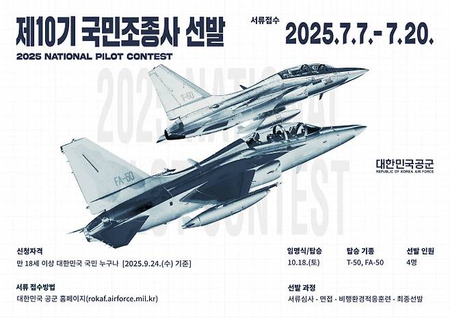 올해에도 4명의 국민조종사가 선발될 예정이다. 만18세(2025년 9월 24일 기준) 이상의 대한민국 국민이라면 누구나 신청할 수 있다. 대한민국 공군 인터넷 홈페이지에서 관련 서류를 공지사항 안내에 따라 작성한 후 웹 혹은 모바일을 통해 7월 20일까지 제출하면 된다.