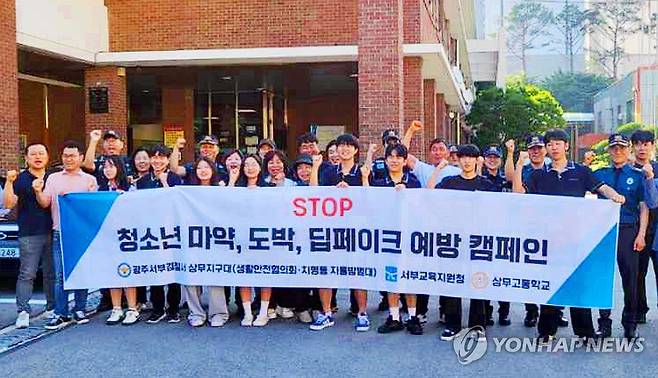 (광주=연합뉴스) 23일 오전 광주 서구 상무고등학교에서 열린 서부경찰서 상무지구대의 '청소년 마약·도박·딥페이크 예방 캠페인'에서 참가자들이 기념사진을 찍고 있다. 생활안전협의회, 치평동 자율방범대와 함께 한 이날 캠페인은 늘어나는 청소년 범죄를 근절하기 위해 마련됐다. 캠페인에 참가한 상무지구대 경찰관들은 범죄 예방 방법이 담긴 책자를 학생들에게 나눠줬다. 2025.6.23 [광주 서부경찰서 제공. 재판매 및 DB 금지]