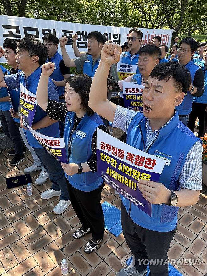 (구미=연합뉴스) 김현태 기자 = 23일 오전 경북 구미시청 앞에서 경상북도 공무원노동조합 조합원들이 공무원 폭행으로 물의를 일으킨 구미시의회 안주찬 의원의 제명 및 즉각 사퇴를 촉구하는 집회를 하고 있다. 구미시의회는 이날 안 시의원의 제명안을 본회의에 상정해 표결에 부친다. 2025.6.23