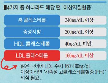 혈증은 다음 4가지 중 하나라도 해당될 때 진단된다. △LDL 콜레스테롤(나쁜 콜레스테롤): 160㎎/dL 이상 △총 콜레스테롤: 240㎎/dL 이상 △중성지방: 200㎎/dL 이상 △HDL 콜레스테롤(좋은 콜레스테롤): 40㎎/dL 미만 등이다. 이 수치들은 혈관 건강에 있어 위험 신호이며, 특히 특별한 질환이 없는데도 젊은 나이에 LDL 수치가 160~190㎎/dL 이상이라면 ‘가족성 고콜레스테롤혈증(FH)’이라는 유전 질환을 의심해볼 필요가 있다.