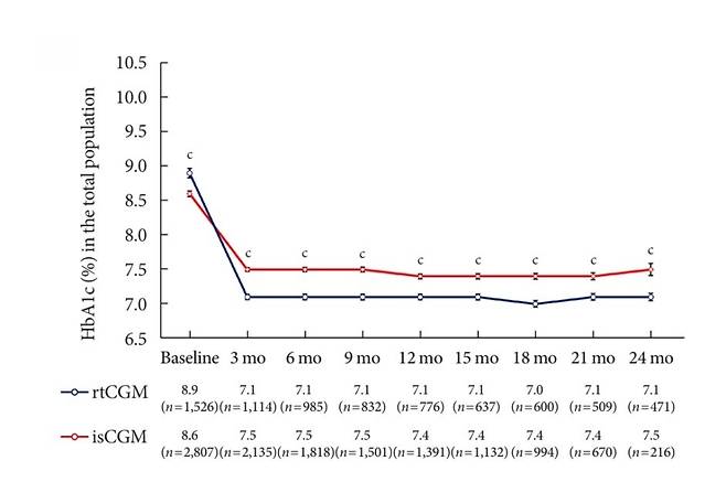 추적 관찰 종료까지 모든 시점에서 간헐적 스캔형 혈당측정기보다 실시간 연속혈당측정기를 사용할 때 당화혈색소 수치가 낮았다.