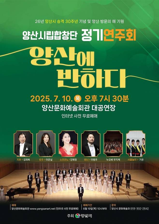 경남 양산시는 7월 10일 목요일 저녁 7시 30분부터 90분간 양산문화예술회관 대공연장에서 양산시립합창단의 정기연주회 '양산에 반하다'를 개최한다.