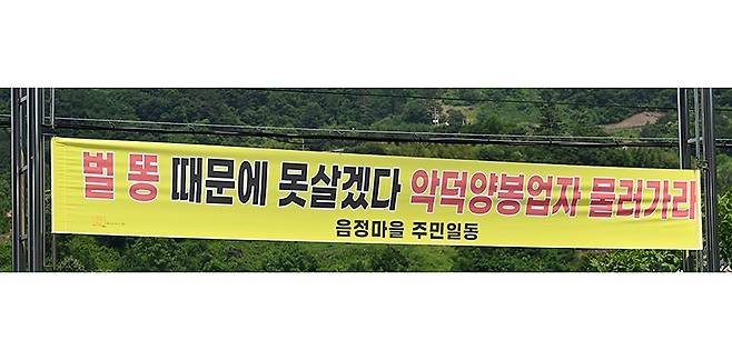 | ▲ 음정마을 주민들이 ‘벌 똥 때문에 못살겠다 악덕양봉업자 물러가라’는 현수막 을 게첨헸다. |