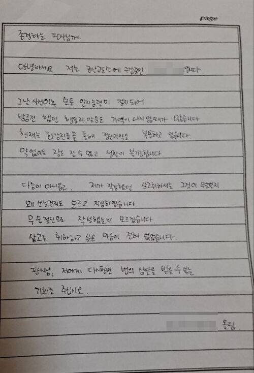 "'존경하는 판사님께'로 시작하는 편지에는 '저는 사건 이후 모든 인지능력이 정지돼 조금 전 했던 행동과 말도 기억나지 않을 때가 많습니다. 제가 작성했던 상고취하서는 그게 무엇인지, 왜 쓰는 건지도 모르고 작성했습니다. 상고를 취하하고 싶은 마음이 전혀 없습니다. 판사님 저에게 다시 한번 법의 심판을 받을 기회를 주십시오."라고 쓰였습니다.