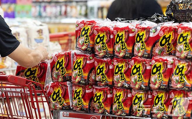 23일 서울 시내의 한 대형마트를 찾은 관광객이 라면을 카트에 담고 있다. 2025.6.23/뉴스1