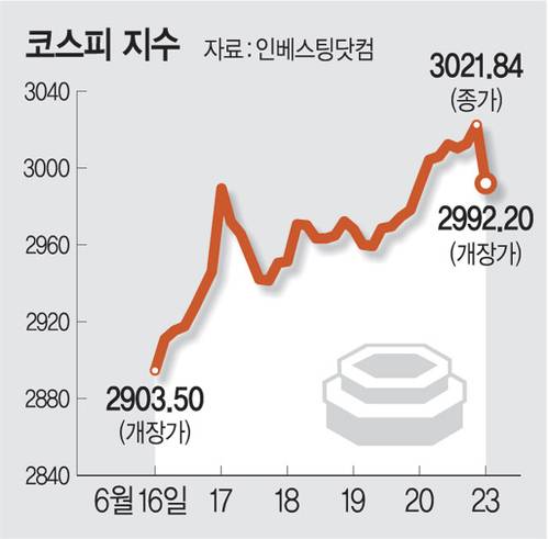 23일 한국거래소에 따르면 코스피는 전일 대비 1.01%(29.64포인트) 하락한 2992.20으로 장을 시작, 이후 오전 11시 현재 3000.58을 기록하고 있다. 지난주 3021.84로 장을 마친 코스피는 장 출발과 함께 3000선 아래로 떨어졌다. 같은 시간 기관과 외국인 투자자가 각각 5542억 원, 3414억 원 쌍끌이 매도에 나서면서 약세장을 이끌고 있다.