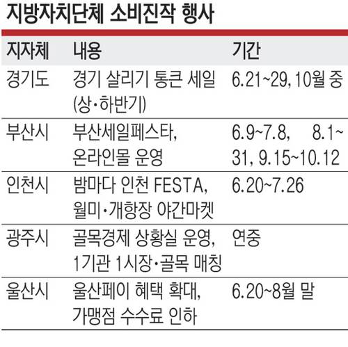 부산시도 지역 소상공인과 전통시장, 온라인몰을 아우르는 ‘부산세일페스타’를 내달 8일까지 개최한다. 이어 8월과 추석 연휴 기간 등 두세 차례 할인행사를 이어갈 예정이다. 행사 기간 온라인 유통채널 3개사(네이버·지마켓·11번가)와 동백전(지역상품몰)에 지역 소상공인 제품 판매를 위한 ‘부산전용관’을 각각 개설하고 10~20% 할인 프로모션을 진행한다.
