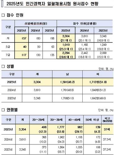 인사혁신처는 '2025년 국가공무원 민간경력자 일괄채용시험' 응시원서를 접수한 결과 157명 선발에 총 3304명이 지원했다고 23일 밝혔다.