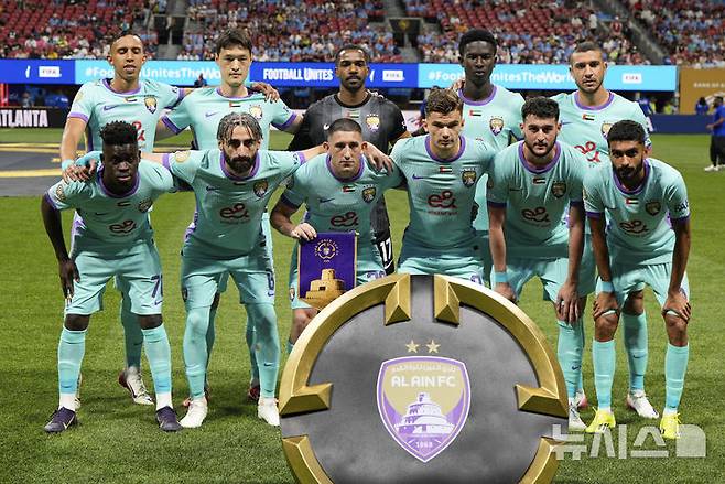 [애틀랜타=AP/뉴시스] 알아인(아랍에미리트)의 박용우(뒷줄 왼쪽 두 번째)가 동료들과 함께 22일(현지 시간) 미 조지아주 애틀랜타의 메르세데스-벤츠 스타디움에서 열리는 2025 국제축구연맹(FIFA) 클럽 월드컵 조별리그 G조 2차전 맨체스터 시티(영국)와의 경기를 앞두고 기념 촬영하고 있다. 지난 1차전에서 유벤투스에 0-5로 패했던 알아인은 이날 맨시티에 0-6으로 패해 유럽 축구의 높은 벽을 실감하며 조별리그에서 탈락했다. 2025.06.23.