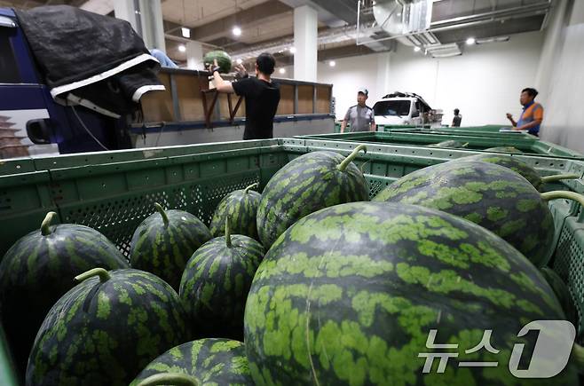 (수원=뉴스1) 김영운 기자 = 무더운 날씨를 보인 23일 오전 경기 수원시 권선구 수원농수산물도매시장 과일동에서 상인들이 수박을 옮기고 있다. 2025.6.23/뉴스1
