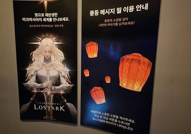 스태츄 전시관을 통과하면 메인 스테이지가 등장한다. 보자마자 놀랄 정도로 넓었다. 초대형 스크린에 각종 일러스트와 영상이 나타나니까 옛 추억이 떠올랐고 발키리를 볼 땐 기대감이 차올랐다. 메인 스테이지 양 옆에 배치된 쿠크세이튼의 방, 갤러리 룸, 풍등 메시지 월 체험방도 소소한 즐거움을 제공했다.