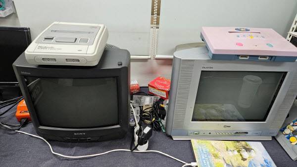 우선 게임을 구입하면 직접 레트로 게임을 플레이할 수 있는 공간이 있었네요. 슈퍼패미콤이나 패미콤을 이용해서 자리에 앉아 플레이해볼 수 있었어요. 소니 트리니트론과 LG 플래트론 CRT TV가 구비되어 있었습니다. 둘 다 화질 좋죠~