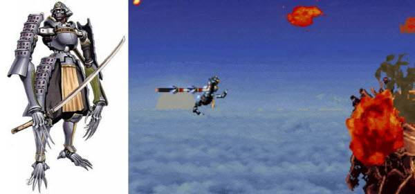 하가네는 이 게임의 적인 '겐쇼'에게 자신의 원래 몸을 빼앗기고 기계화가 된 인간이라는 설정을 가지고 있습니다. 본체는 실험관에 보존되어 있고, 의식만 로봇에게 옮겨갔다는 것이죠. 그래서 캐릭터들 중에 가장 키도 크고 느리지만 공격이 가장 강력한 편입니다. 로보트의 설정을 잘 따르고 있는 거죠.