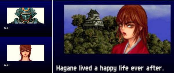조기자: 이 하가네가 여성이라는 것은 엔딩에서 밝혀지는데요, 별도의 비밀 루트를 타면 여성 캐릭터로 변신하게 되죠. 본 모습은 붉은 머리에 점이 있는 보이시한 글래머 누님입니다. 본명은 키리에라고 하고, 뭐랄까.. 이 게임 시리즈의 감초인 적 여성 닌자와도 매서운 눈빛 등 닮은 부분이 있습니다.