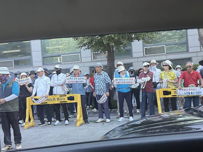 | ▲ 울산남구가 태화강 파크골프장을 유료화 하자 이용자들이 남구청사에 모여 반대 집회를 하고 있다. |
