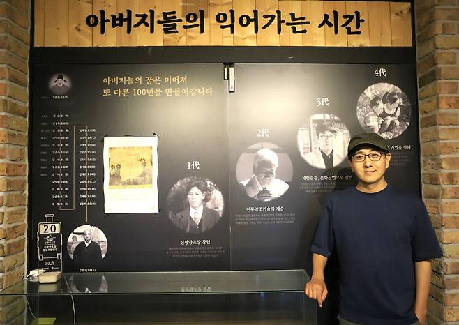 | ▲ “아버지들의 잊혀지지 않는 시간” 신평양조장 내부 벽면에 조성된 ‘가문의 계보 전시관’ 앞에는 1대 창업자 김순식에서부터 2대 김용세, 3대 김동교, 4대 손자에 이르기까지 가업의 전통이 세대를 넘어 어떻게 이어지고 있는지를 보여주는 계보가 자세히 담겨 있다. |