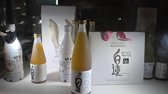 | ▲ 신평양조장의 대표 브랜드 ‘백련막걸리(白蓮)’ 제품 진열 장면. ‘하얀 연꽃’이라는 이름처럼, 연꽃잎을 발효 공정에 활용해 은은한 향과 부드러운 맛을 자랑하는 프리미엄 생막걸리다. 전통의 깊이와 현대적 감각을 함께 담은 세련된 디자인 패키지는 젊은 세대의 눈길도 사로잡으며, 신세계백화점 인천공항점 등에서도 판매되고 있다. 무엇보다 연간 800여 명의 폴란드 관광객이 방문하여, 당진 지역성과 상품성을 동시에 인정받은 스테디셀러다. |