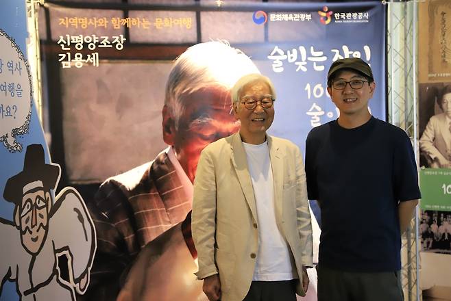 | ▲ 문화체육관광부와 한국관광공사가 주관한 전통문화 캠페인 현장에서, 신평양조장의 2대 김용세 명인(왼쪽)과 3대 김동교 대표(오른쪽)가 함께한 모습이다. 등 뒤로 보이는 대형 배너는 “술빛은 장인의 시간”이라는 주제로 김용세 명인의 술 인생을 조명하고 있다. 사진 속 두 사람은 단순한 부자 관계를 넘어, 90년 양조 명가의 정체성과 철학을 잇는 계승자들이다. |