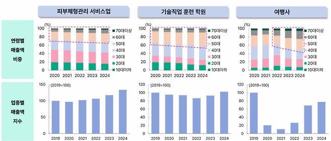 50대는 뷰티·여가 분야에서도 영향력을 확대하고 있다. 피부·체형관리소의 50대 매출 비중은 2019년 17.6%에서 지난해 22%로 상승했고, 여행사의 경우 2022년 21.8%에서 지난해 25.5%로 늘었다.