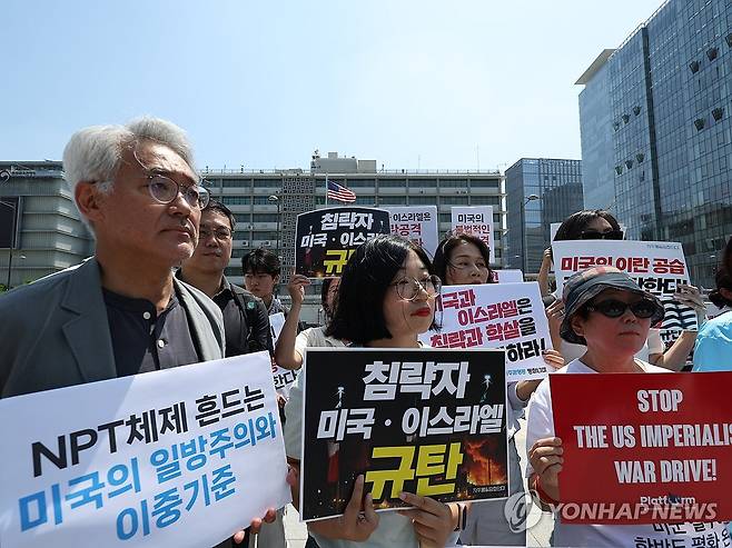 (서울=연합뉴스) 이지은 기자 = 참여연대, 민주사회를위한변호사모임, 전국민중행동 등 시민사회단체 회원들이 23일 서울 종로구 주한미국대사관 인근에서 기자회견을 열고 미국의 이란 공격을 규탄하고 있다. 2025.6.23