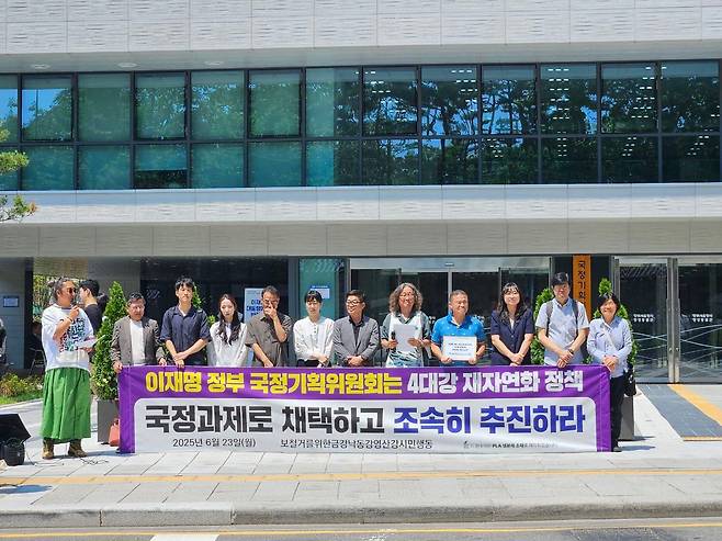 6월 23일 서울 종로구 효자동 국정기획위원회 정문 앞에서 열린 기자회견에서 환경단체들이 던진 경고음이다. 지난 17일, 용산 대통령실 앞에서 기자회견을 열고 이재명 대통령의 환경 제1공약인 '4대강 재자연화'의 시급한 이행을 촉구했던 보철거를위한금강낙동강영산강시민행동은 이날에도 위와 같은 우려를 전한 뒤, 국정기획위를 향해 4대강재자연화를 국정과제로 채택할 것을 촉구했다.