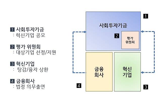 | ▲ 사회투자기금 작동 방식 정부, 금융회사, 혁신기업 간 협치를 통한 사회투자 프로그램 |