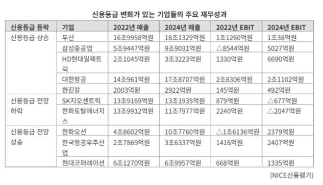 이처럼 두산을 비롯해 실적과 수주가 돋보인 삼성중공업, HD현대일렉트릭, 대한항공, 한진칼 등의 신용등급이 개선됐다.