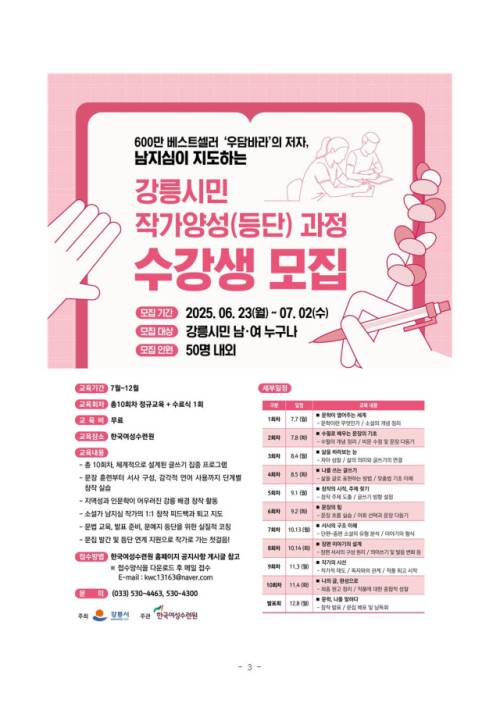 교육에는 강릉 출신 남지심 작가가 참여한다. 소설집 ‘우담바라’로 600만부 이상 판매를 기록한 남 작가는 현대인의 내면과 삶의 결을 섬세하게 그려내는 서사로 주목받아 왔다. 이번 프로그램을 통해 참가자들의 문학적 성장을 깊이 있게 이끌 예정이다.