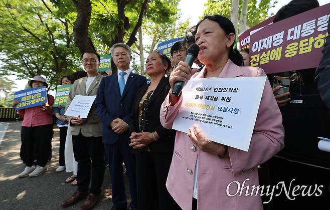 | ▲ 베트남전 민간인학살 등 인권침해 진실규명 촉구 1만 시민 청원 한국을 방문한 베트남전 민간인학살 피해생존자인 응우옌티탄(퐁니학살 피해생존자)씨, 응우옌티탄(하미학살 피해생존자. 동명이인)씨와 베트남전쟁 문제의 정의로운 해결을 위한 시민사회 네트워크 대표단이 23일 오전 서울 용산 대통령실 앞에서 ‘이재명 대통령에게 요구하는 베트남전 민간인학살 등 인권침해 진실규명 촉구 1만 시민 청원’ 제출 면담에 대한 사후 브리핑을 하고 있다. |