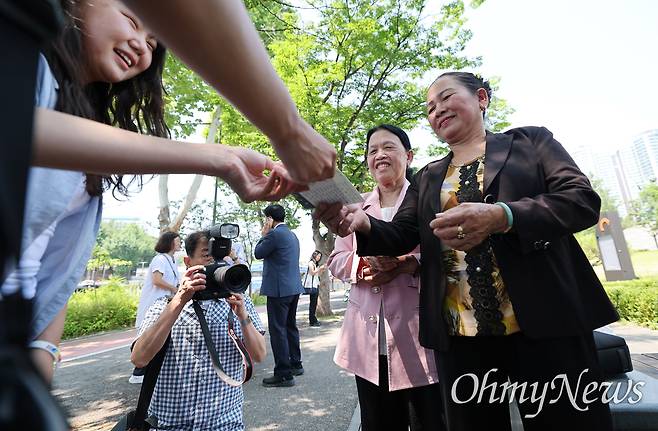 한국을 방문한 베트남전 민간인학살 피해생존자인 응우옌티탄(퐁니학살 피해생존자)씨, 응우옌티탄(하미학살 피해생존자. 동명이인)씨가 23일 오전 서울 용산 대통령실 앞에서 '이재명 대통령에게 요구하는 베트남전 민간인학살 등 인권침해 진실규명 촉구 1만 시민 청원' 제출 면담에 대한 사후 브리핑이 끝난 뒤 '베트남전쟁 문제의 정의로운 해결을 위한 시민사회 네트워크' 회원 및 시민들과 작별 인사를 나누고 있다.