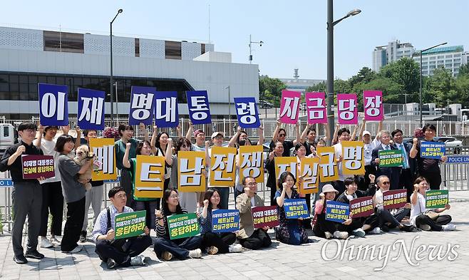 | ▲ 베트남전 민간인학살 등 인권침해 진실규명 촉구 1만 시민 청원 한국을 방문한 베트남전 민간인학살 피해생존자인 응우옌티탄(퐁니학살 피해생존자)씨, 응우옌티탄(하미학살 피해생존자. 동명이인)씨와 베트남전쟁 문제의 정의로운 해결을 위한 시민사회 네트워크 대표단이 23일 오전 서울 용산 대통령실 앞에서 ‘이재명 대통령에게 요구하는 베트남전 민간인학살 등 인권침해 진실규명 촉구 1만 시민 청원’ 제출 면담에 대한 사후 브리핑을 마친 뒤 준비해 온 피켓을 들고 기념촬영을 하고 있다. |