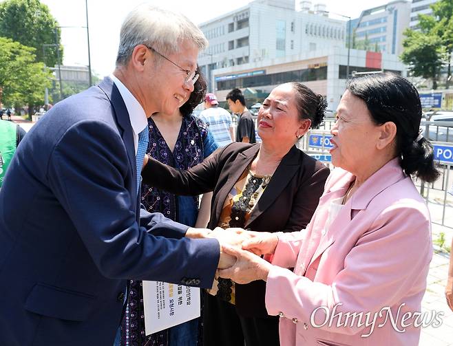 | ▲ 베트남전 민간인학살 등 인권침해 진실규명 촉구 1만 시민 청원 한국을 방문한 베트남전 민간인학살 피해생존자인 응우옌티탄(퐁니학살 피해생존자), 응우옌티탄(하미학살 피해생존자. 동명이인)과 베트남전쟁 문제의 정의로운 해결을 위한 시민사회 네트워크 대표단이 23일 오전 서울 용산 대통령실 앞에서 ‘이재명 대통령에게 요구하는 베트남전 민간인학살 등 인권침해 진실규명 촉구 1만 시민 청원’ 제출 면담에 대한 사후 브리핑을 하고 있다. 국회 기자회견과 토론회를 주선한 더불어민주당 민형배 의원과 응우옌티탄(퐁니학살)과 응우옌티탄(하미학살. 동명이인) 피해생존자들이 인사를 나누고 있다. |