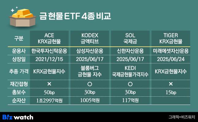 차별화 포인트로 저렴한 보수를 내세웠다. TIGER KRX금현물 ETF의 총보수는 경쟁사 상품의 절반 수준인 15bp(1bp=0.01%포인트)다. 한투운용 상품의 총보수는 50bp이며, 삼성운용과 신한운용 상품의 총보수는 30bp다.