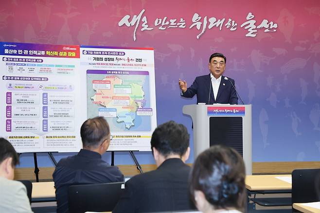| ▲ 김두겸 울산시장이 23일 시청 프레스센터에서 전국 최초 울산발 민·관 인적교류 혁신적 성과 창출 관련 언론 브리핑을 하고있다. |