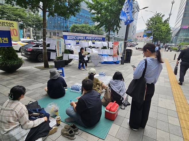 | ▲ 전태일평전 읽기 A주얼리 해고노동자들은 6월 13일부터 서울지방고용노동청 앞에서 <전태일평전> 읽기를 시작했다. |