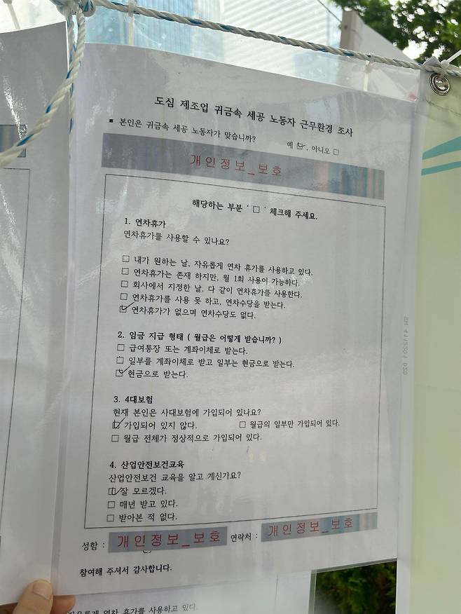 | ▲ 주얼리노동자 근무환경 조사 설문지 금속노조 주얼리분회가 주얼리 노동자를 대상으로 근무환경을 조사한 설문지. 대부분의 주얼리 노동자는 연차휴가가 없으며, 임금은 현금으로 직접 받고, 4대보험에 가입되어 있지 않았다. |