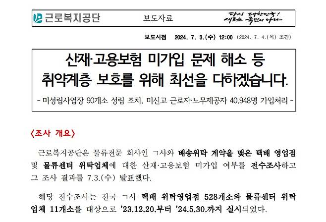 | ▲ 근로복지공단의 고용보험 미가입 전수조사 관련 보도자료 2024. 7. 근로복지공단은 쿠팡의 배송위탁업체에 대해, 산재·고용보험 미가입 여부를 전수조사하고 보험 직권 가입 및 과태료 부과조치를 했다는 내용으로 보도자료를 냈다. |